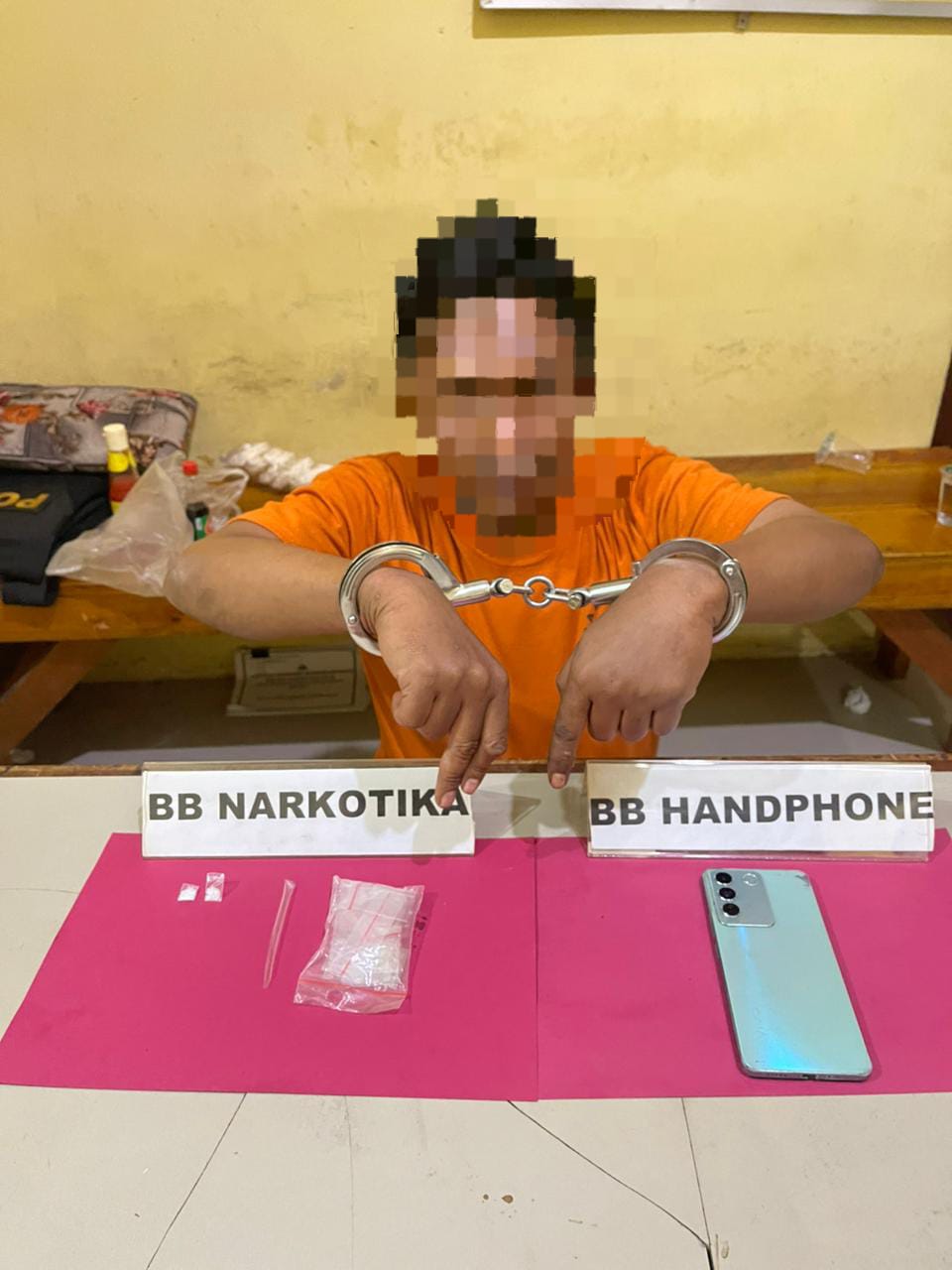 Saat dilakukan penggeledahan dengan disaksikan oleh ketua pemuda Desa Penghidupan, petugas menemukan barang bukti berupa 2 paket diduga narkotika jenis sabu yang dibungkus dengan plastik klip bening (0.21 gram), 1 buah plastik klip kosong, 1 buah plastik sendok sabu, 1 unit handphone Android merk VIVO V 27 E warna hijau.