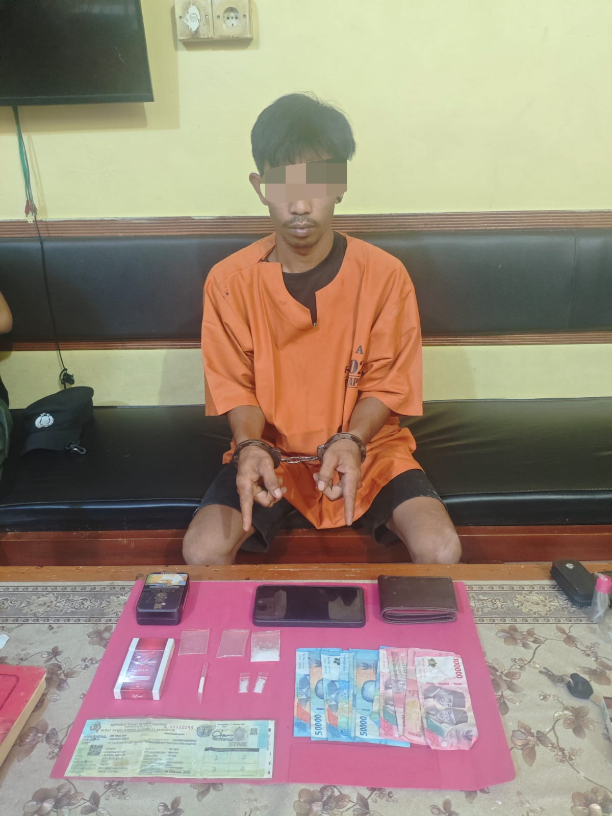 Setelah itu, petugas berhasil mengamankan pelaku dan kita melakukan penggeledahan terhadap pelaku dan ditemukan barang bukti 1 paket sedang jenis sabu ditemukan di dalam Jok motonya, 2 paket kecil diduga sabu-sabu di dashboard motornya, sendok terbuat dari pipet, 2 plastik bening, kotak Rokok Djsamsue, dompet kulit warna coklat, handphone merek Vivo Y21 D warna ungu, surat berharga STNK atas nama pelaku dan uang tunai sebesar Rp.800.000.