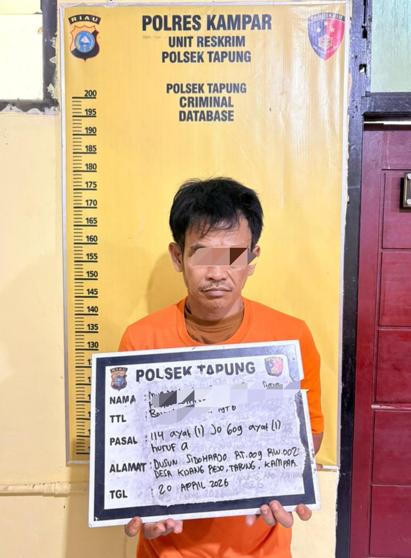 Pelaku adalah MU (50) warga Desa Kijang Rejo, Kecamatan Tapung darinya berhasil disita 4 paket Sabu. “Pelaku sudah melanggar Pasal 114 UU RI Nomor 35 tahun 2009 tentang Narkotika Jo pasal 609 ayat (1) huruf a Undang-Undang Nomor 1 tahun 2023 tentang KUH.Pidana dan UU RI No. 1 tahun 2026 tentang penyesuaian pidana,”jelas Kapolres Kampar AKBP Boby Putra Ramadhan S melalui Kapolsek Tapung Kompol Y E Bambang Dewanto, Selasa (21/4/2026).