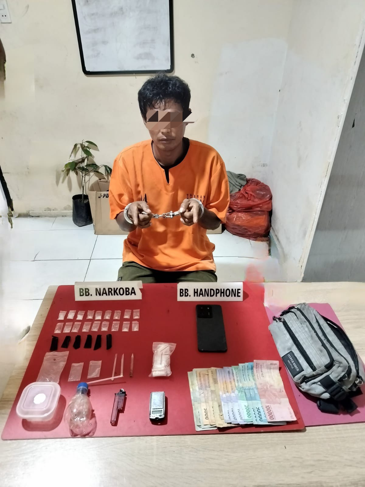 Tim opsnal langsung menuju TKP melakukan penangkapan terhadap pelaku SA yang mana pada saat itu pelaku sedang bermain game Online menggunakan Hp dibelakang pondok, “petugas langsung geledah pelaku dan menemukan barang bukti diduga narkotika jenis sabu-sabu sebanyak 18paket kecil dengan rincian yaitu 12 di temukan diatas bangku tempat ia bermain Hp dan 6 paket ditemukan dalam tas pinggang milik pelaku,”terangnya.